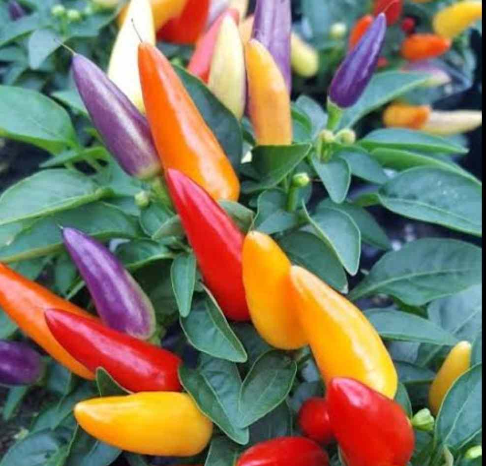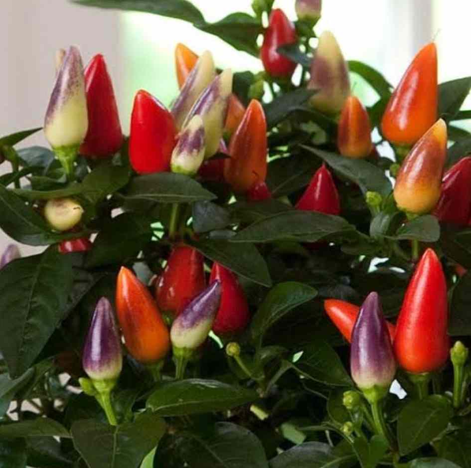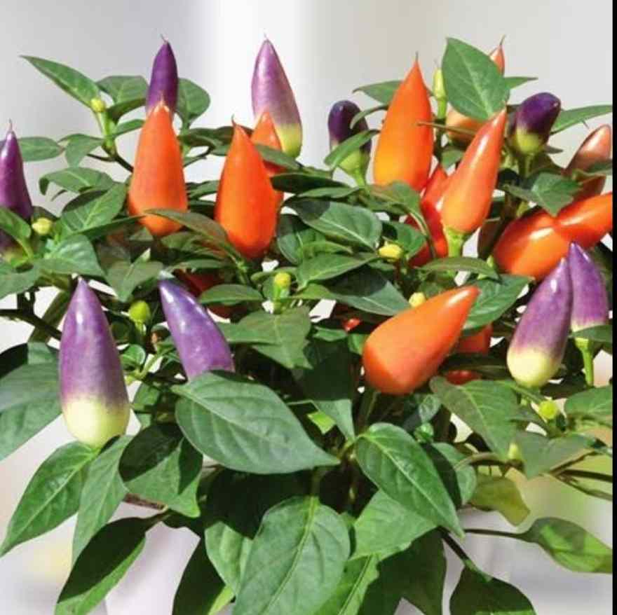 Acapulco Multicolour Chilli ( Capsicum annuum ) are a beautiful little ornamental sweet chilli with very little to no heat. Originating in Mexico, they are commonly grown as an ornamental for the range of colours it displays at the same time. The Acapulco Multicolour Chilli is much like a Bolivian Rainbow Chilli, except the plant itself is small and its chillies are often bicoloured as well. The colours displayed are red; purple; white and orange and can be eaten straight from the plant.