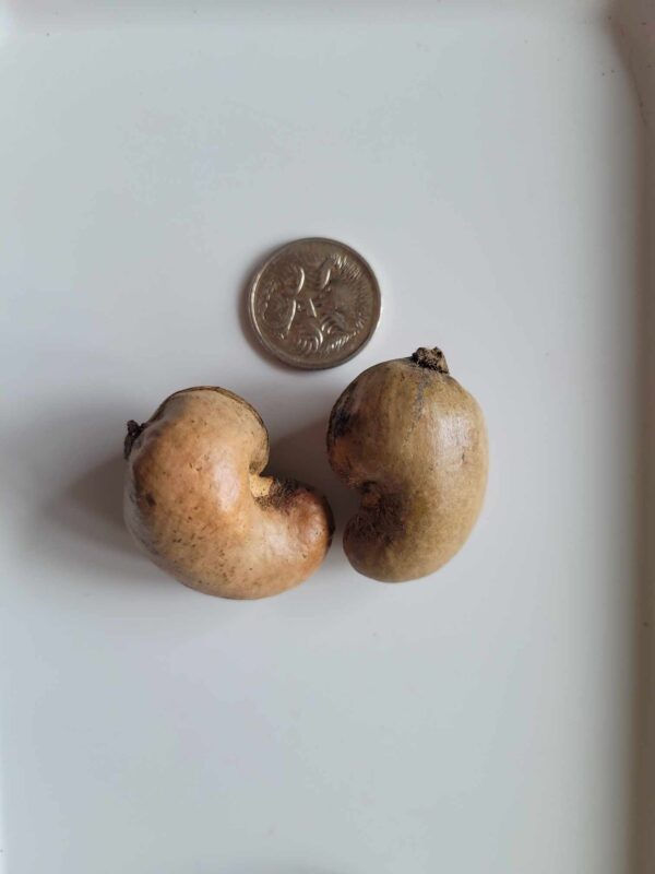 The curved fruit is shaped like a large thick bean and can reach 2.5cm (1 inch) long. It appears like one end has been forcibly sunk into a pear-shaped swollen stem of what is called the Cashew Apple. The Cashew Apple is an accessory fruit, is about three times as large as the true fruit and is reddish, yellow.