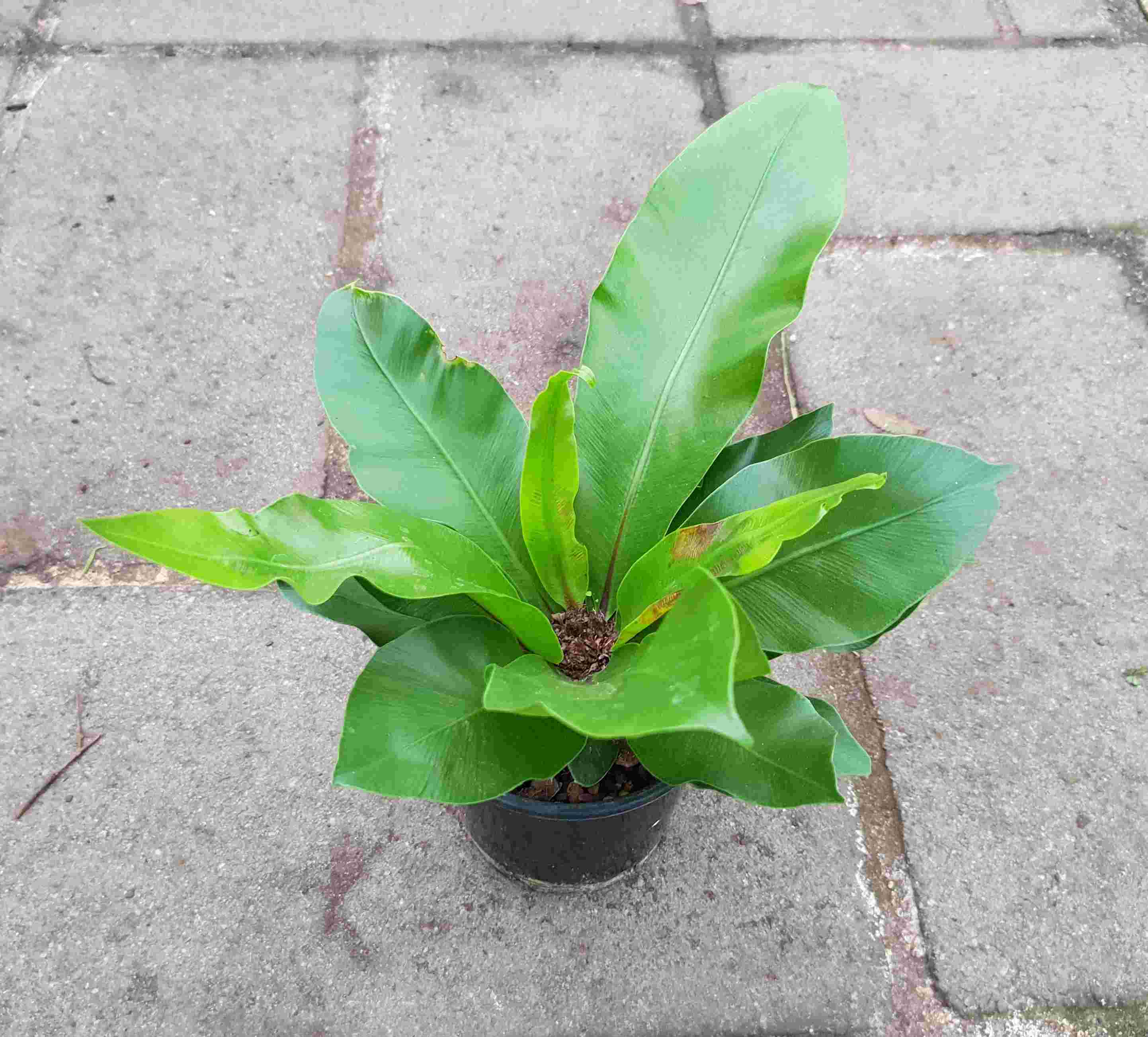 Asplenium nidus is evergreen, and its fronds can grow up to just over a metre but more commonly around 60 cm’s tall and 20 cm’s wide. The leaves (fronds) are glossy, bright green and are slightly ribbed and the main frond rib is almost black in colour. The fronds grow from the inside, oldest ones on the outside and are curved inwards to collect and move rainwater to its centre and base, like a funnel.