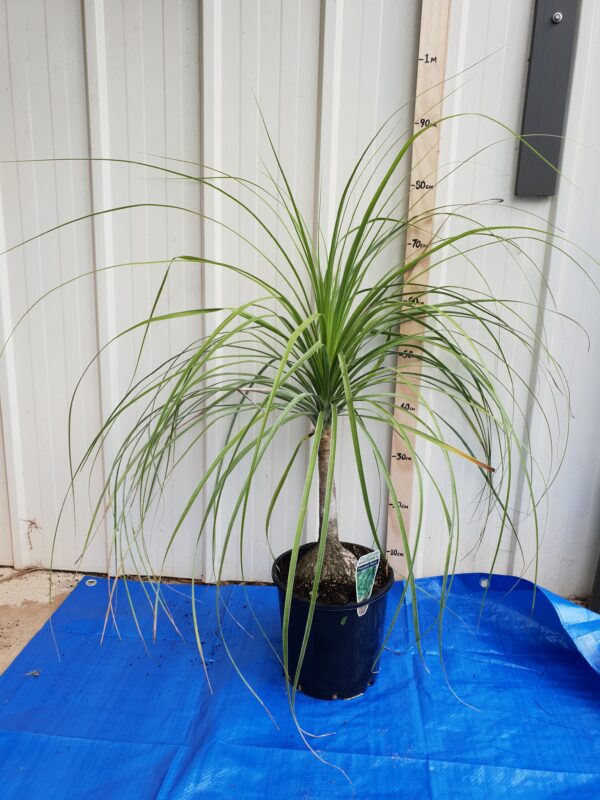 Beaucarnea recurvata is an evergreen perennial that grows to heights of up to 10 metres (32 feet) and up to 1.5 metres wide (5 feet). Ponytail Palms grow a single palm-like stem that has a notably wide caudex that is used for storing water. They are slow growers are very drought-tolerant, going eight months without rain in their natural habitat. Leaves are green lineal, thin, flat and bend like arches. They can eventually reach up to 4.5 metres long (14.5 feet) which is roughly half the maximum height of the tree. Leaves should not be trimmed as they will lose their distinctive shape.