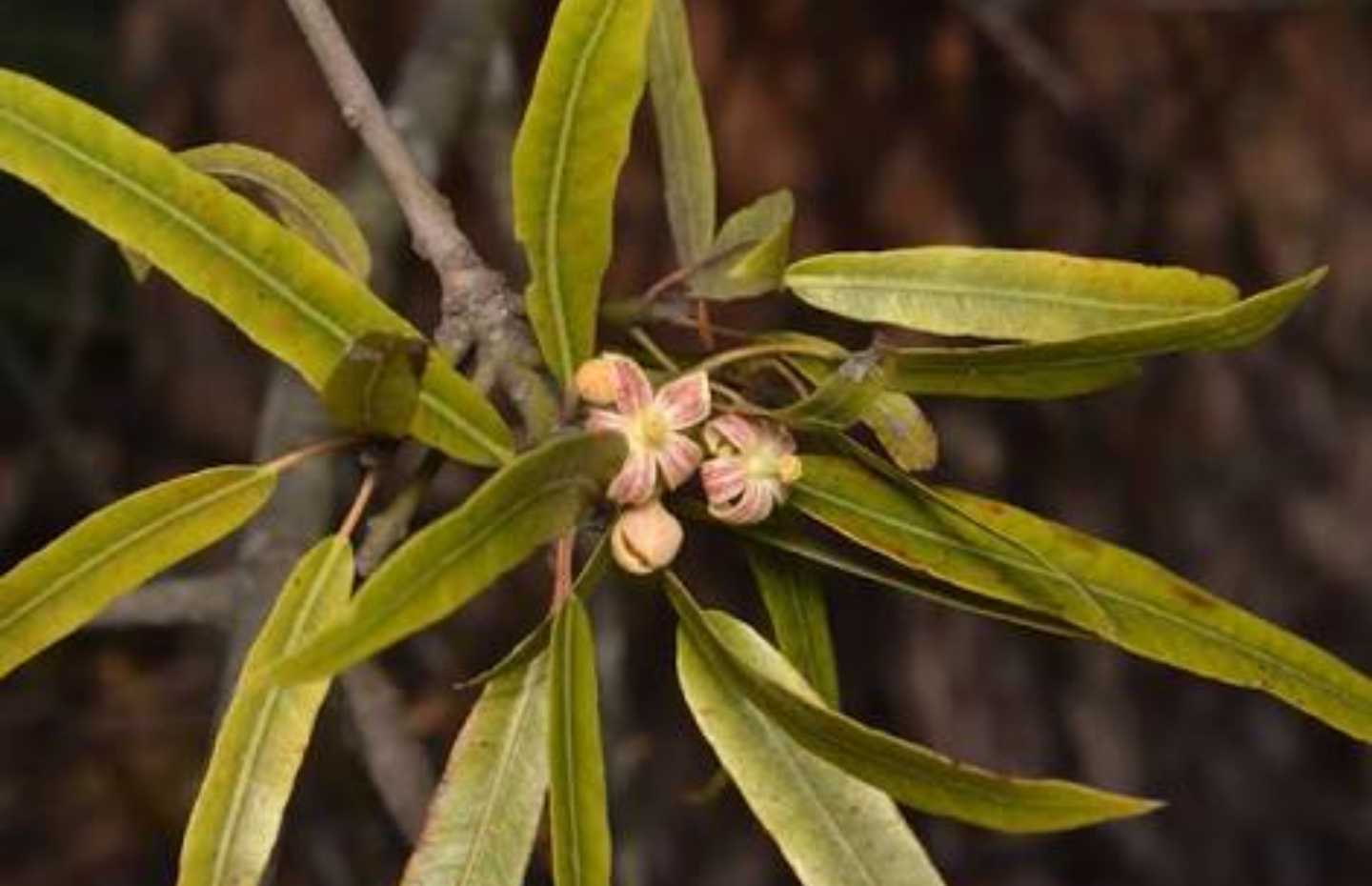 The leaves are long and thin; even at a young age and grow to approximately 10 cm metres long & 1-1.5 cm wide They are olive green colour on top with a lighter colour underneath. The Queensland bottle tree also has very pretty lily like flowers that are pink with a white edging and a stripe through the middle of each petal. The flowers are usually seen in early summer, are star shaped and once they are completely open, the petals curve under.