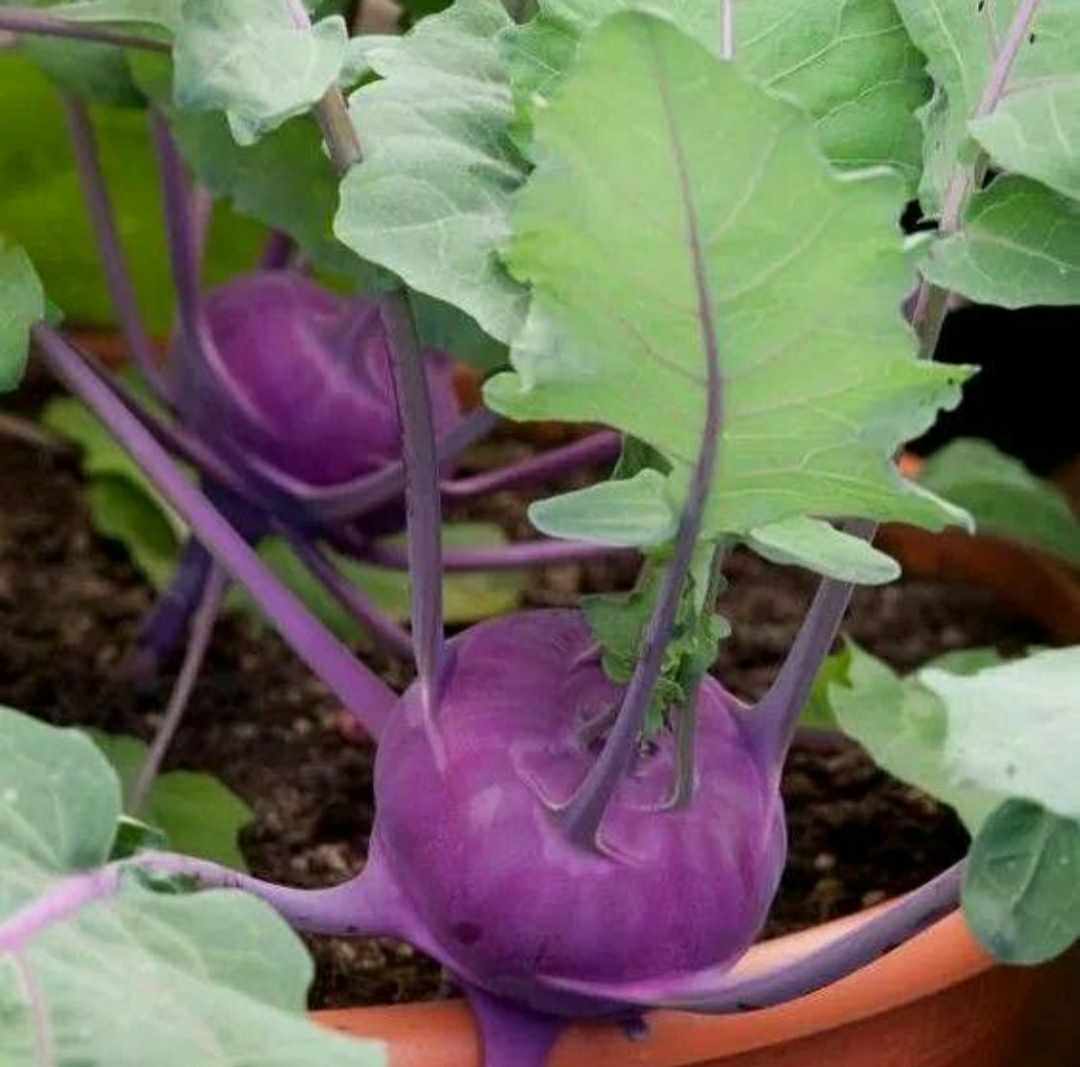 This variety grows up to around 15-20 cm’s above ground, with roughly a 25 cm spread. Kohl Rabi Purple Vienna can be harvested once it is 3-7 cm’s in diameter and are best harvested when smaller, because they can become woody with age. The leaves and stems are also edible and are often used as a kale or spinach substitute. It is suitable for any climate if sown at the right time of year and is ready for harvest from seed between 50-60 days depending on conditions. Kohl Rabi can be grown in containers / pots.