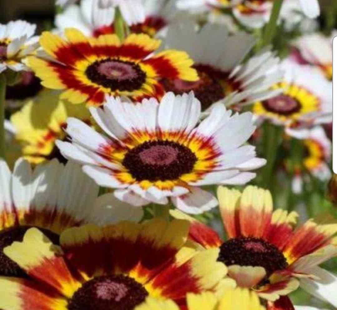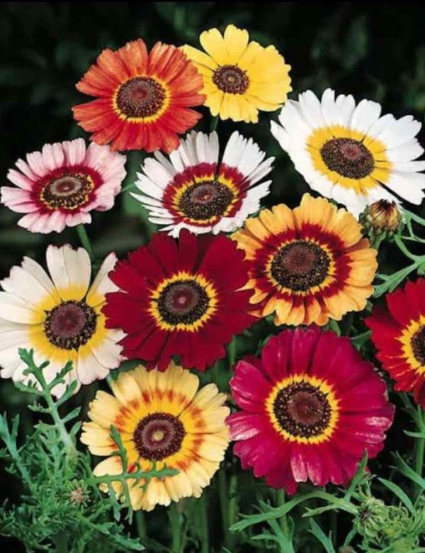 Chrysanthemum Rainbow Mix ( Chrysanthemum carinatum ) are gorgeous annual flowers that produce an abundance of colour in the garden quickly. The flowers range in colours from red, pink, orange, cream, white, burgundy and yellow, most with a mix of two (bicolour) or three (tricolour) colours on a single flower.