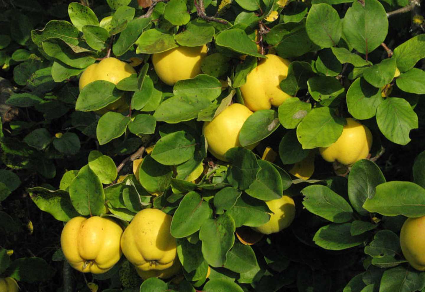 Cydonia oblonga is a short fruit tree that reaches no higher than 8 metres (26 feet) and stretches as wide as 6 metres (20 feet). The fruits flesh is like a pear but is round shaped with a diameter ranging from 7 – 12 cm (3-5 inches. Seeds are poisonous and although there are many recipes available on the internet they can cause irritation to the throat and difficulty breathing.