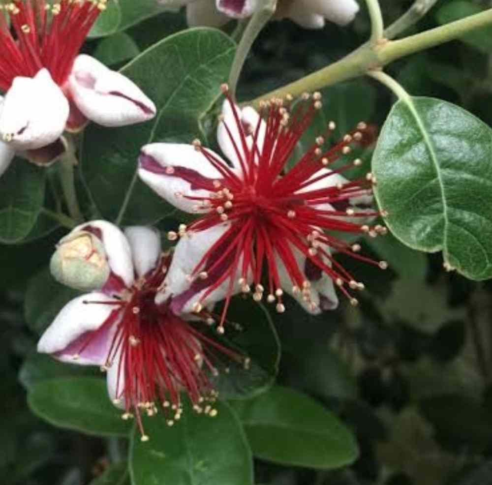 Feijoa sellowiana ( Pineapple Guava ) is an evergreen fruit shrub that is native to temperate regions of Brazil, Argentina, Uruguay and Paraguay. Pineapple Guava shrubs not only produce popular egg-sized fruits but is widely grown as an ornamental flowering hedge. The fruits taste like a combination of pineapple and guava with hint of spearmint but spoils quickly which is why they aren’t often seen in supermarkets.