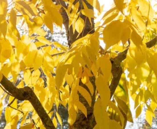 The White Ash trees usually have seven leaflets on each leaf and their common name is given due to the pale colour on the underside of the leaves. In Autumn, the leaves turn yellow and then orange before sometimes reaching an almost purplish colour prior to falling during Winter.