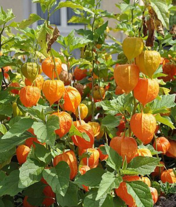 Flowers are hermaphrodite, bell-shaped and drops off once pollinated, exposing the calyx which provides protection for the berry to grow. Fruits are round, yellow almost orange in colour and resemble yellow cherry tomatoes and with their calyx intact appear like Chinese lanterns.