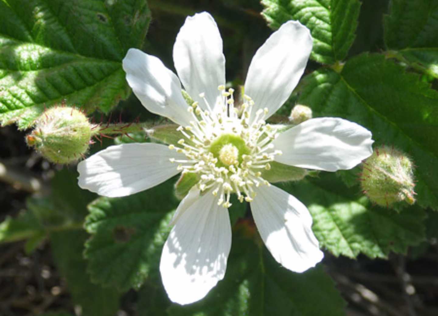 Rubus ursinus is a flowering deciduous shrub that grows to a compact height of up to 1.5 metre (5 feet) and as wide as 1.8 metres (6 feet). This species has thorny vines to protect itself from foragers and can sometimes become invasive if not aggressively pruned after the fruiting season. And although the plant is a perennial, each vine fruits biennially, meaning that it grows fresh stems every year but takes two years for them to flower and produce fruit.