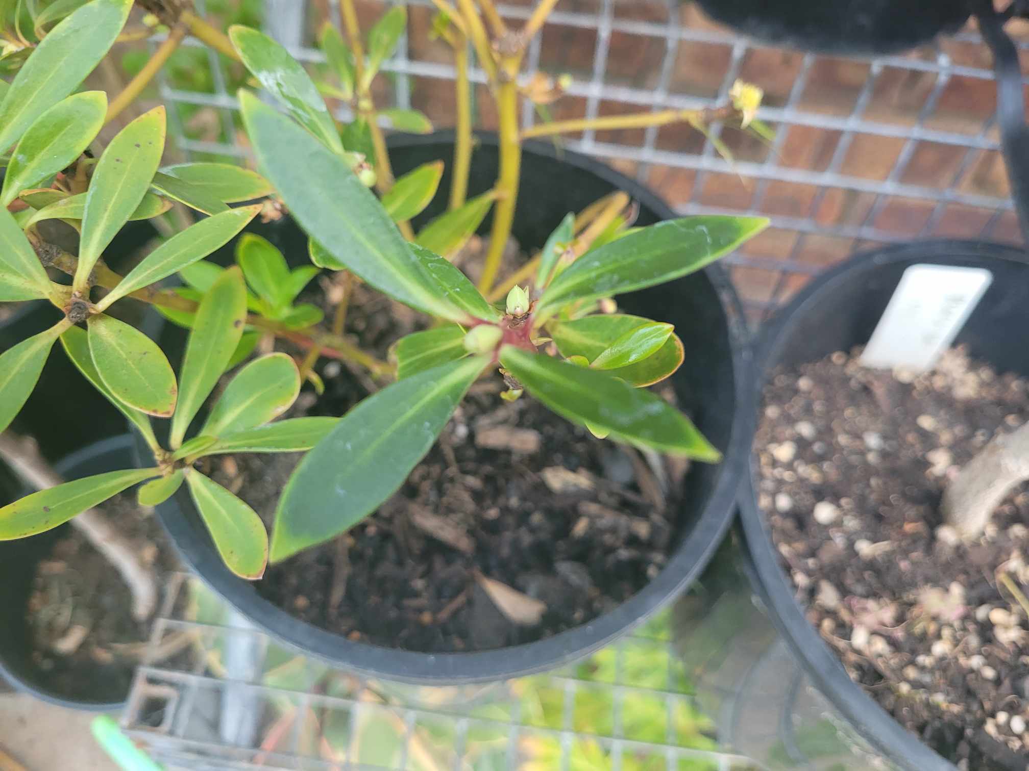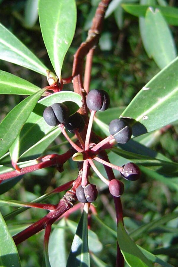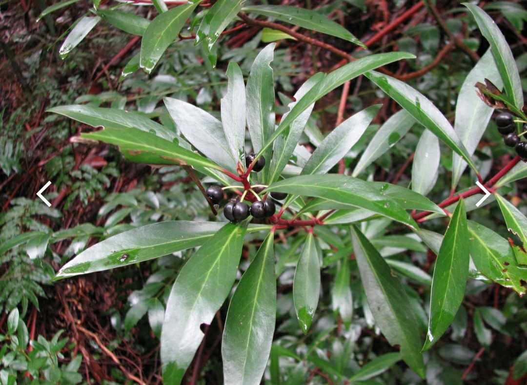 They enjoy regular moisture without getting waterlogged and will wither quickly if the soil is left to dry out. Leaves are lanceolate to narrow-elliptic and reach up to 12cm (4.5 inches) long, are aromatic and have a pale colour underneath. The stems are red and during the fruiting season provide a great contrast of colours with the darker berries. Unfortunately, Tasmannia lanceolata is dioecious, meaning separate female and male plants are required to produce berries.