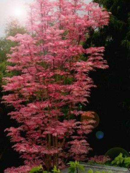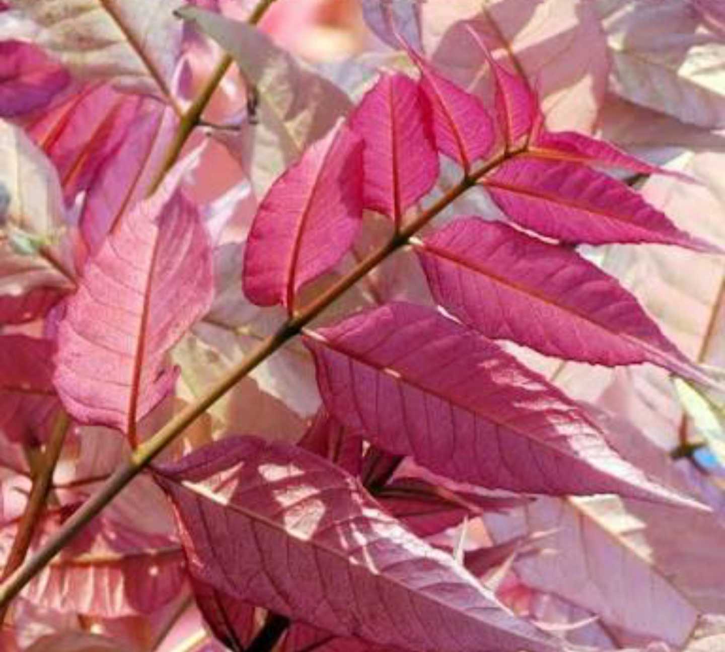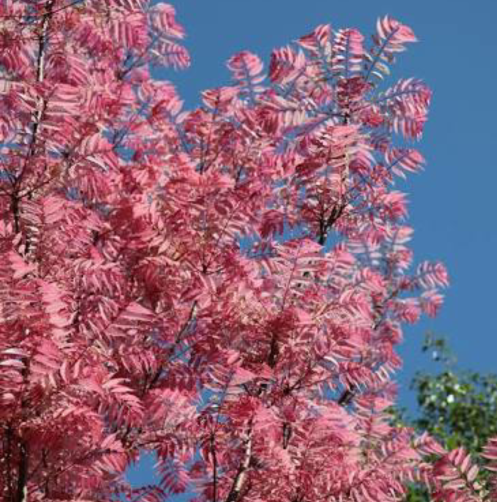 The leaves are pinnate with 10-40 leaflets and can be as long as 70cm (28 inches) and as wide as 40cm (16 inches). Young leaves are reddish brown or purple and produce a sweet fragrance. Pink flowers are produced through Summer as panicles that grow to 50cm (20 inches) long.